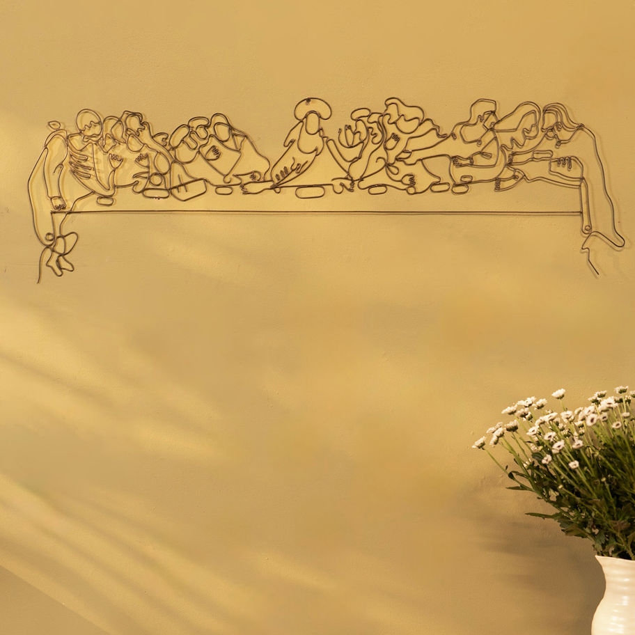 Sacred art, pared back to its purest form, this handcrafted piece is shaped from black metal wire, a minimalist depiction of the Last Supper without the confines of a frame. Each curve and line is bent by hand, capturing the essence of the scene with quiet reverence and striking simplicity.
