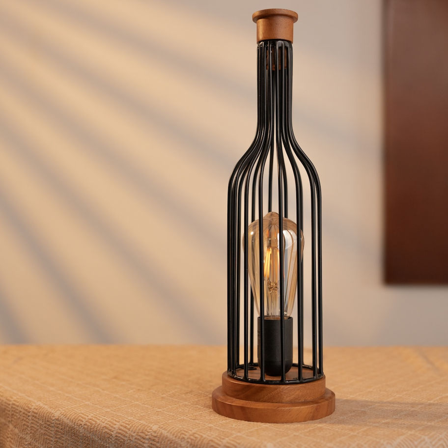 Crafted with warmth, this lamp takes the form of a wine bottle, its body shaped from hand-worked black metal, balanced by a base and cap carved from dark, polished wood. The pairing of sturdy iron with smooth timber lends the piece a rustic sophistication.